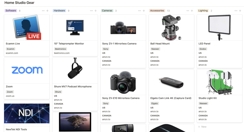 Create your own home studio tracker in Notion to organize current and future gear. This simple template is ready for you to add your studio gear and track brands, links, pricing, and priority.